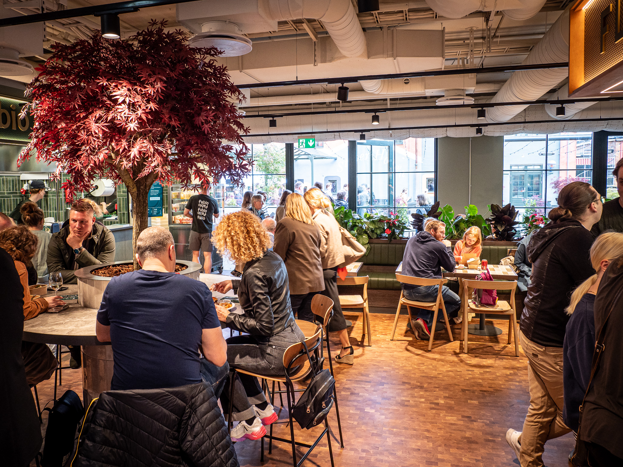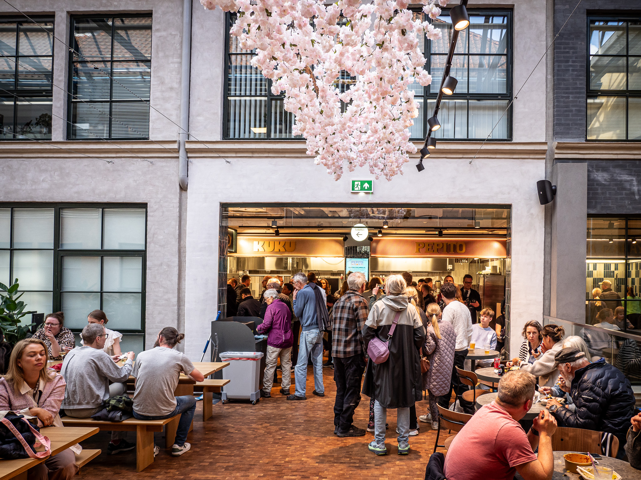 Balkonen Food Hall byder på både inden- og udendørs siddepladser, og fra balkonen er der direkte adgang til Støberigården, hvor du kan tage en pause i det fri midt i byens liv.